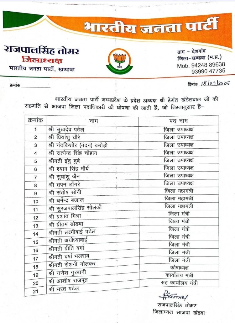 खंडवा। भारतीय जनता पार्टी (भाजपा) द्वारा गुरुवार को घोषित जिला कार्यकारिणी ने स्थानीय राजनीति में उथल-पुथल मचा दी है। सूची जारी होते ही संगठन विस्तार की बजाय गठजोड़, पारिवारिक हिस्सेदारी और जातीय असंतुलन पर सवालों की बौछार शुरू हो गई।